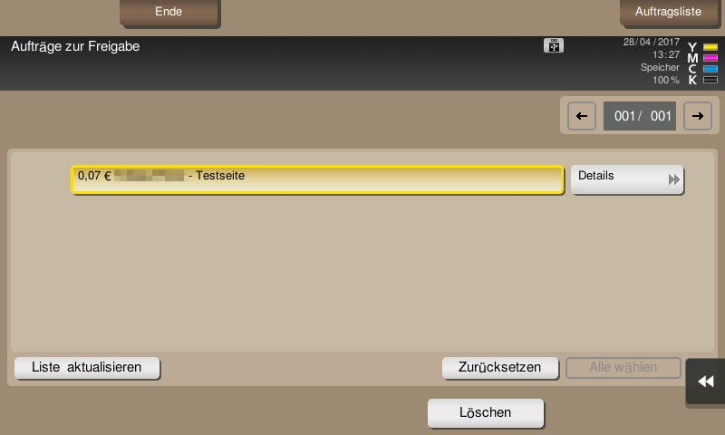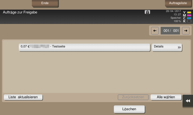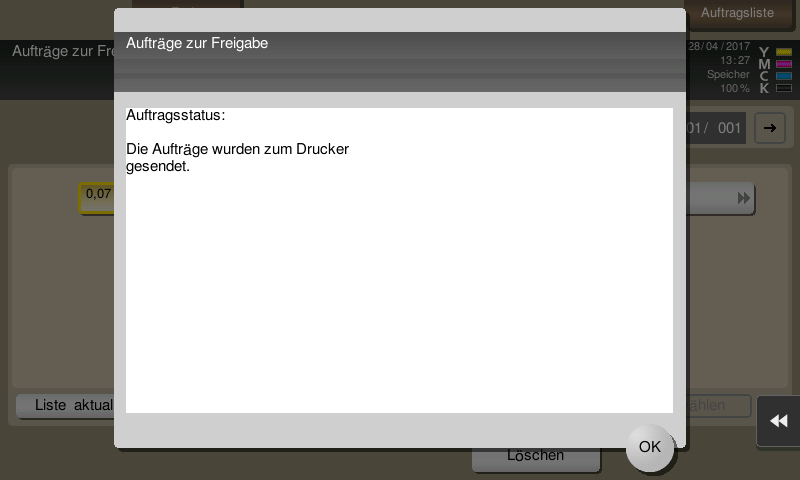 Dort findet er unter Menü dann den Button Freigabe seine gehaltenen Druckjobs und kann ein der beiden Aktionen auswählen: