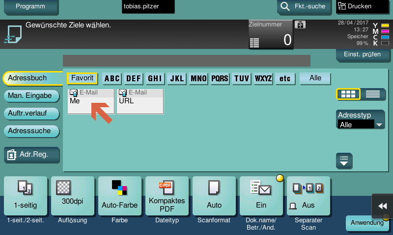 Mit einem Klick auf den ME Button, kann ein Scan direkt an die eigene Adresse ausgelöst werden.
